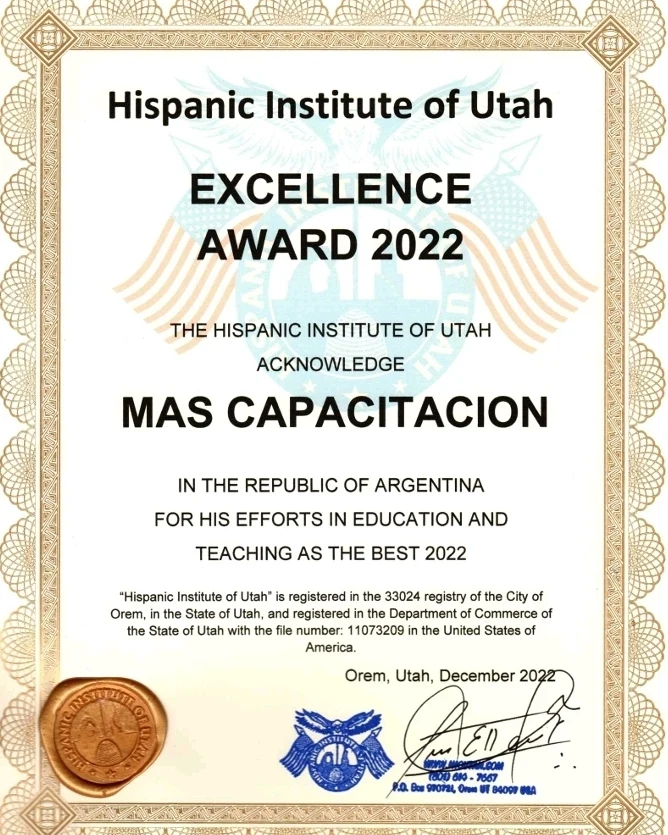 A finales del año 2022, el Hispanic Institute of Utah nos otorgó su prestigioso sello de calidad en reconocimiento a nuestros destacados esfuerzos y logros sobresalientes en el ámbito educativo y de enseñanza en la República Argentina. Este importante reconocimiento refleja nuestro compromiso continuo con la excelencia académica, así como nuestra firme dedicación a mejorar y fortalecer el sector educativo en la región.